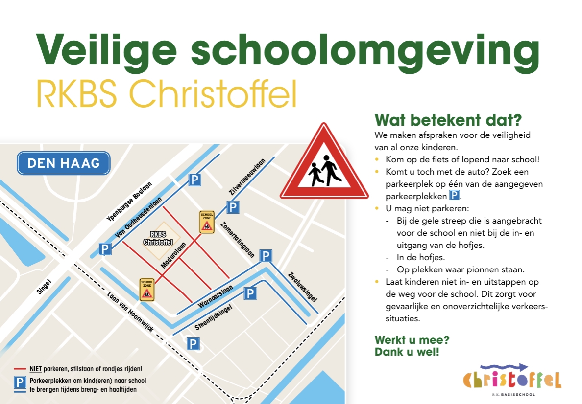 Op RKBS Christoffel hebben wij een actieve werkgroep die zich met de verkeerssituatie rondom de school bezighoudt. Het brengen en halen van de kinderen is een piekmoment in het verkeer en we willen graag dat dat voor alle weggebruikers veilig is. In samenspraak met Veilig Verkeer Nederland is een afsprakenkaart gerealiseerd. Dit zijn de afspraken waar we ons aan houden rondom de school.